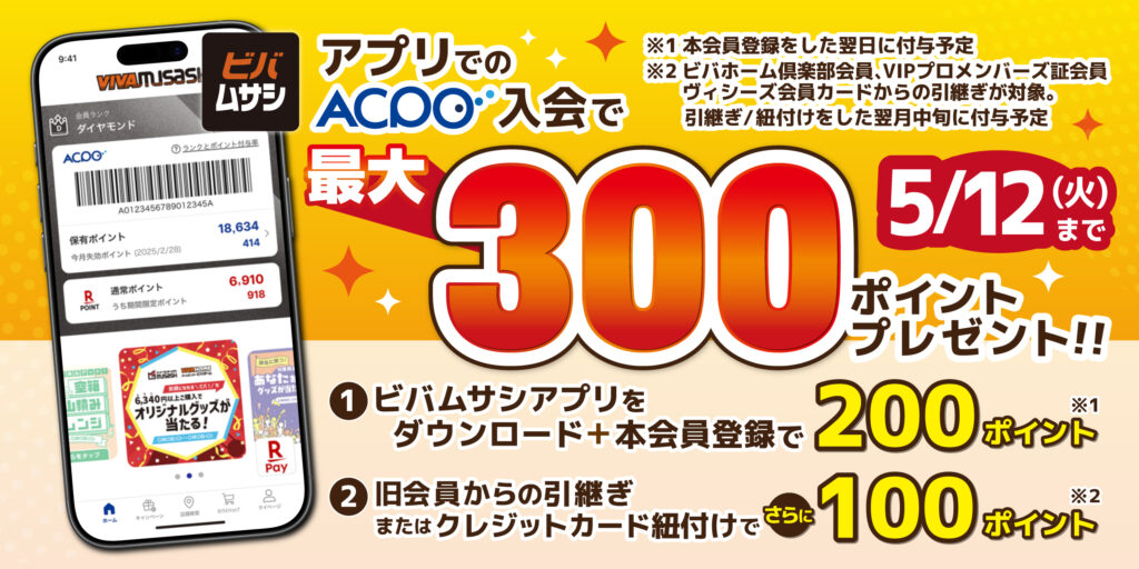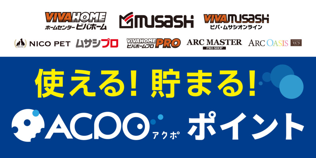 ビバホーム・ムサシで、楽天ポイントが使える・貯まる。200円(税抜)のお支払いで1ポイント貯まり、1円相当として使えます。ACPOポイントも併用でき、ポイントを使うのも、貯めるのも一層お得に。