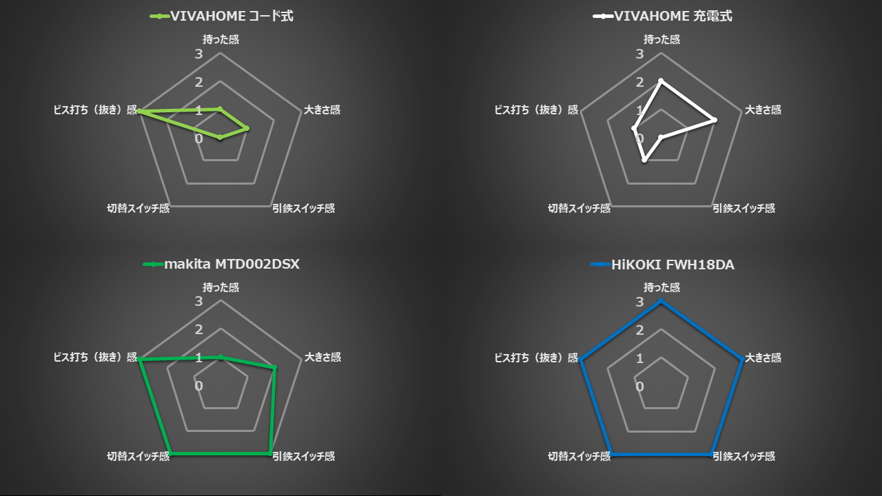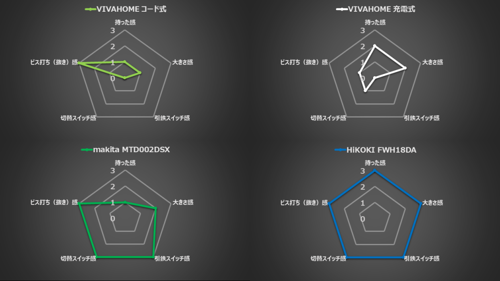 | VIVAHOME コード式 | VIVAHOME 充電式 | makita MTD002DSX | HiKOKI FWH18DA | |