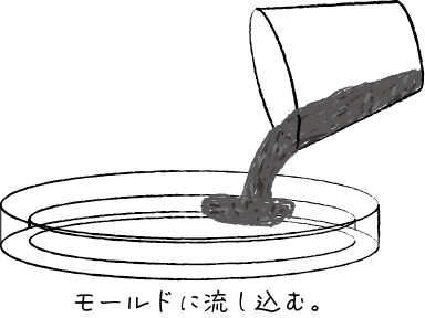 ③①の型をコップなどテープで留めて水平になるよう固定し、①の型(モールド)に②を流し込みます。