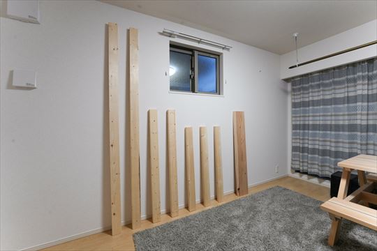 - 8F・・・メインの柱用木材。天井までの長さのものを2本用意しました。