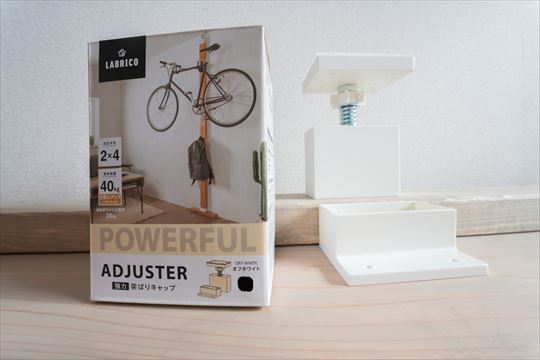 2×4アジャスターとキャップを柱用の木材に被せて、上下の当て木の位置を決めたら、その間に柱を入れる形で立てていきます。