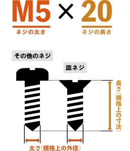 例えば、M5×20と表記があれば、呼び径5mm、長さ20mmのメートルネジといった具合です。