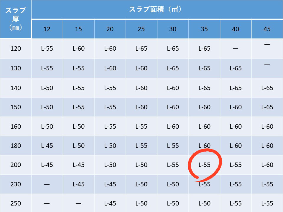 電子ドラムを設置する場所は、【表1】を参照するとコンクリートスラブ(床)の厚さ200㎜・面積35㎡(小梁で分割されている部分)のため、遮音等級の目安はL-55に相当します。
