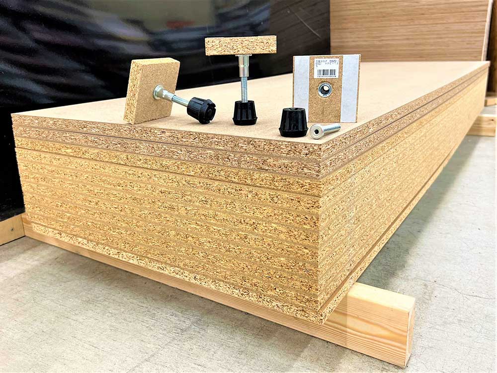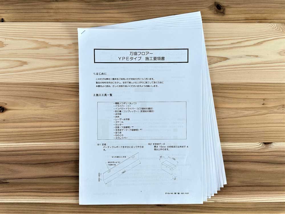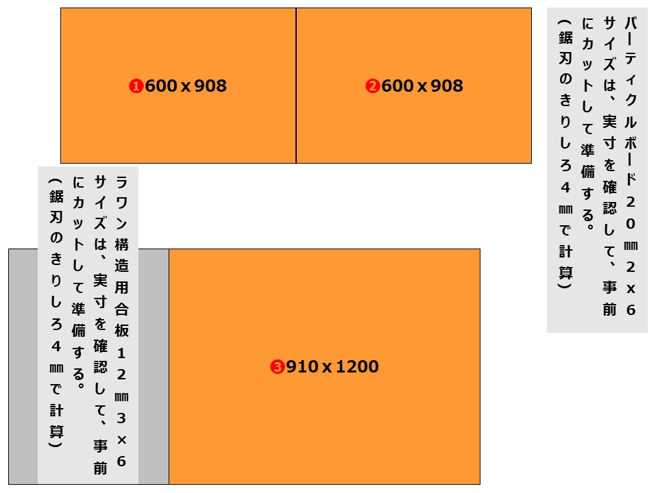 • パーチ(パーティクルボード)木材チップを細かく砕いて接着剤を添加し、板に成形したもので、床では通常600×1820㎜の20㎜厚を使用する。ベニヤ合板に比べて重く、表面が固く、反りにくいが水や湿気には弱い。