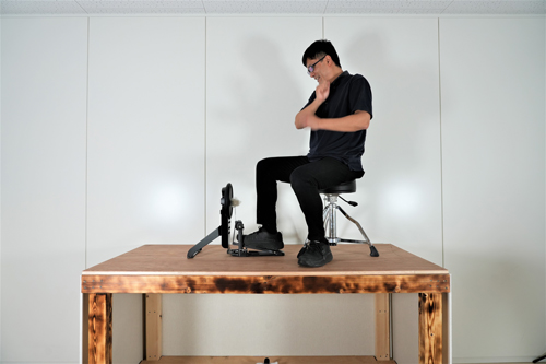 • 次に、実験用架台の上にそれぞれの防音防振二重床ステージをのせて、電子ドラム(キックのみ)・バーチャルサイクリングをそれぞれセッティングして騒音測定します。