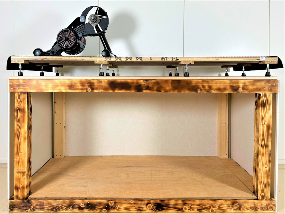 ローラー台と防音防振二重床ステージ(バーチャルサイクリング用)(上)と実験用架台(下)