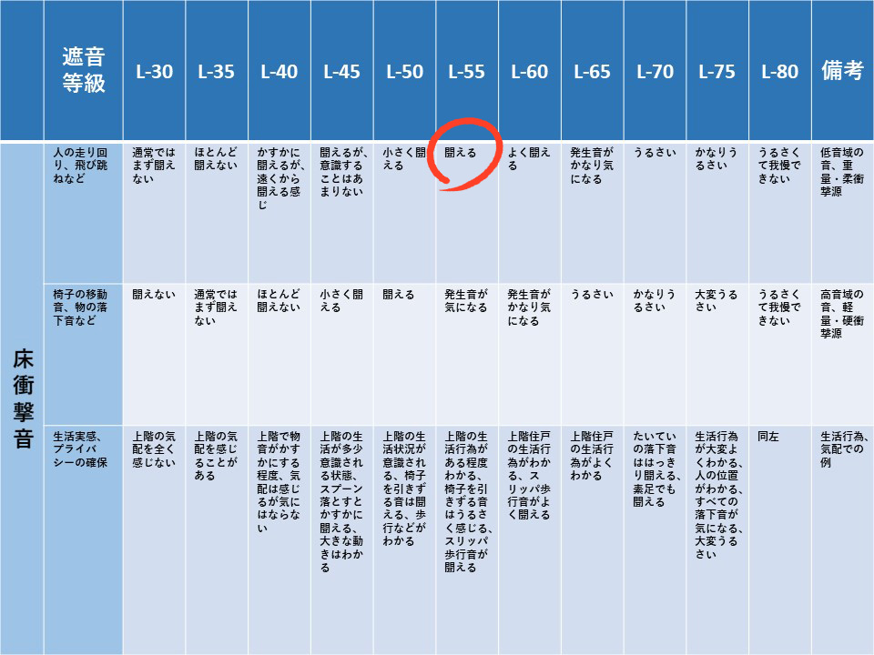 遮音等級L-55は、【表2】を参照すると低音域の音、重量・柔衝撃源で「人の走り回り、飛び跳ねなど、聞こえる」程度ですが、実際の生活実感も同様です。