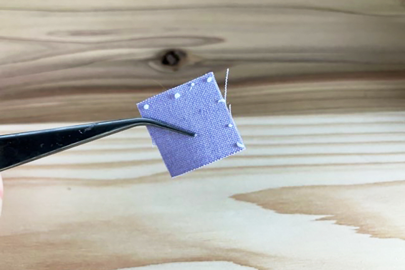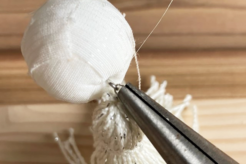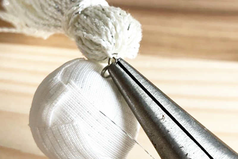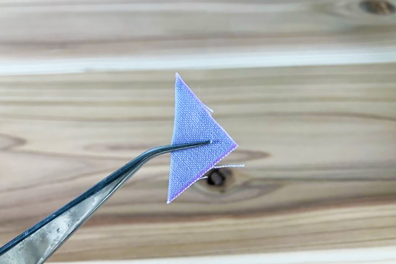 ③針などで布に穴開け9ピンを刺し、反対側を丸ヤットコで丸めます。