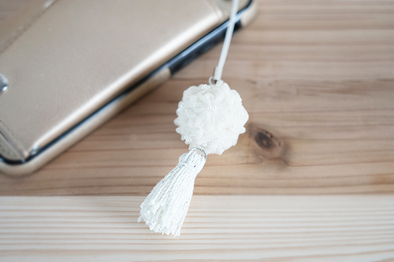 ⑤最後に丸カンでストラップ、タッセルを繋げて完成です!