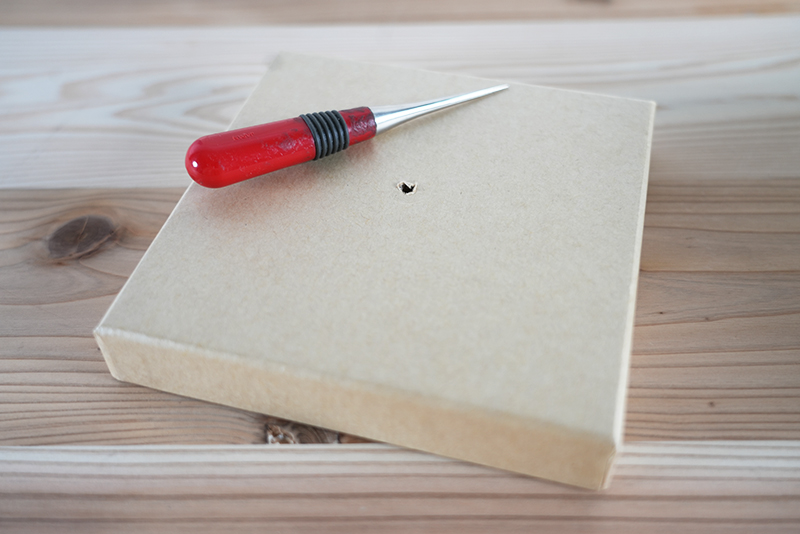 ①ネジタイプの取っ手(つまみ)を付けるかたは下準備で蓋に錐などで穴を開けます。
