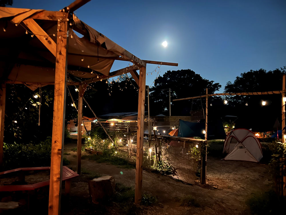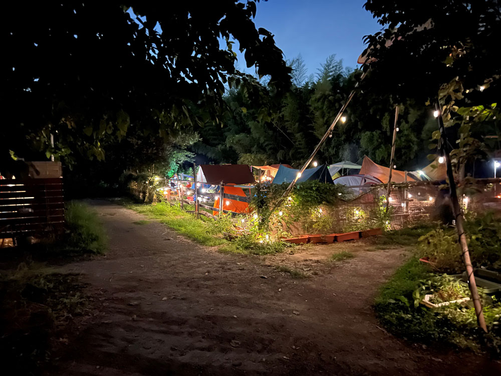 薄暗くなり、あたりはキャンパーさんの焚き火やランプの明かりが、七色のテントを輝かせて、とても幻想的です。