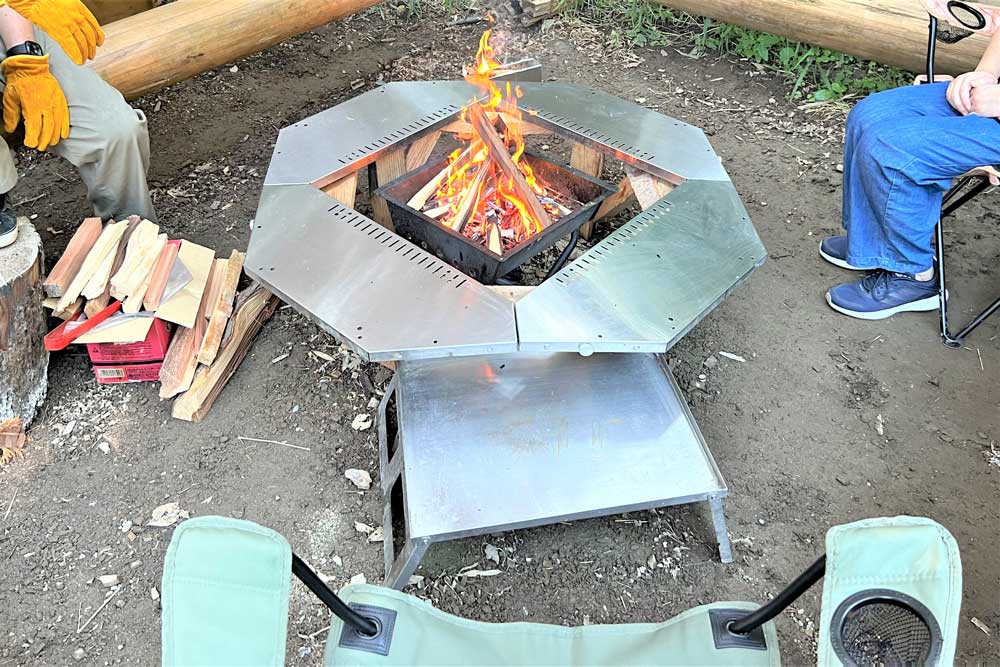 キャンパーさんのテントのそばには、火のはいった焚き火台、BBQのいい香りが…