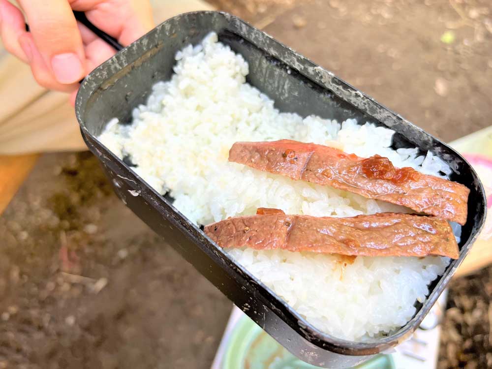 メスティンのふたを豪快に開けて、おこげもおいしい、つやつや銀シャリにドンッ
