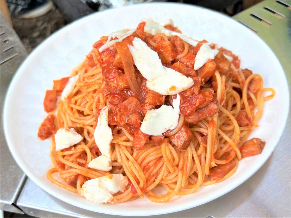 なんとイタリアンシェフの経験があり、本場のアマトリチャーナ(トマトとパンチェッタ、玉ねぎ、チーズのパスタ)をチャチャっと調理します。