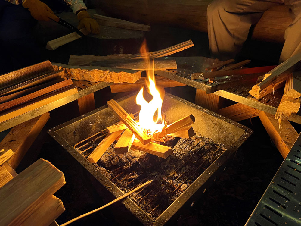 まずは、焚き火から立ち昇る炎(ほのお)とスモークで香ばしく焼きあげた、