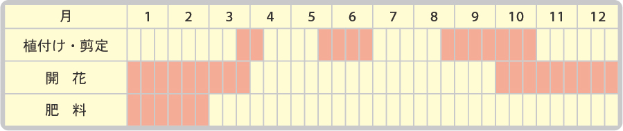 1月~2月に寒肥として株回りに堆肥をすき込みます。花芽分化から開花までの8~9月に追肥として油粕と化成肥料を混ぜて株の回りにばらまきます。
