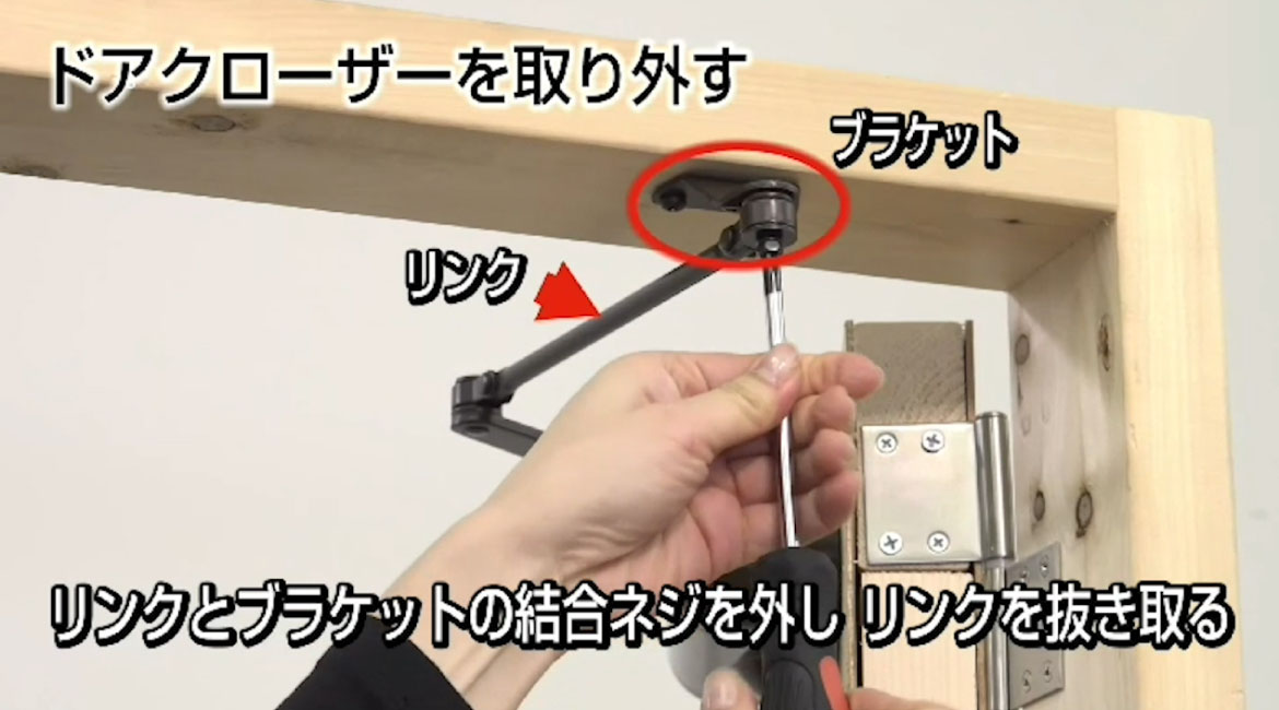 扉を開けた状態でリンクとブラケットの結合ネジを外し、リンクを抜き取ります。