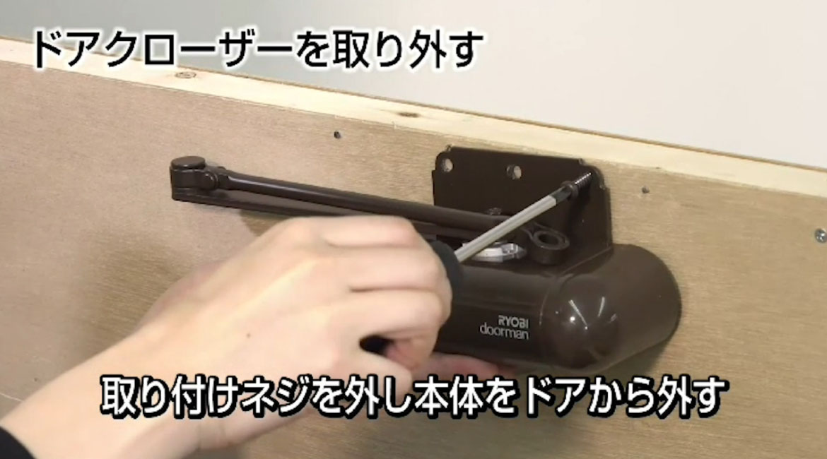 次にドアの取りつけネジを外し、ドアクローザー(本体)を外します。