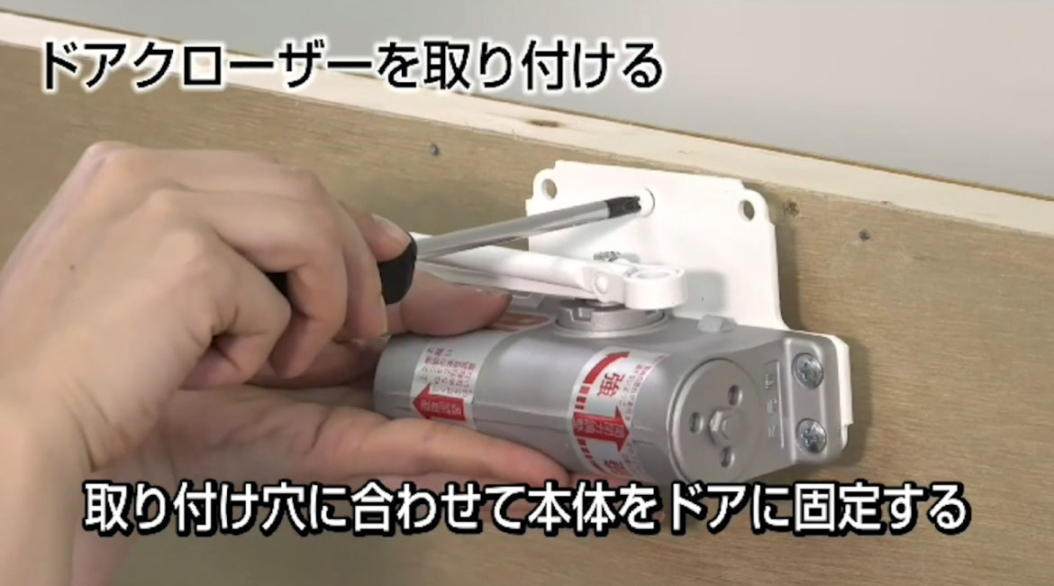 次に本体取りつけネジでドアクローザー(本体)をドアに固定していきます。