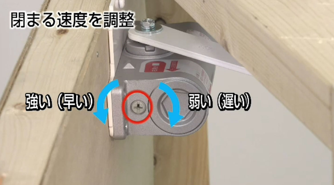 調整用のネジを右に回すと、力が弱まりゆっくりになります。逆に左に回すと力が強まり早くドアを閉めることができます。最後にお好みの速度に調整して頂いて、作業は終了となります。