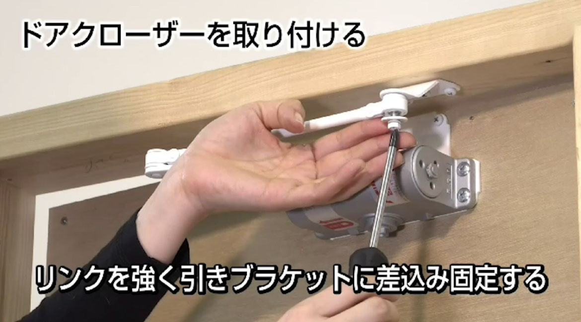 ドアを閉めた状態でリンクを強く引き、ブラケットに差し込みネジで固定します。