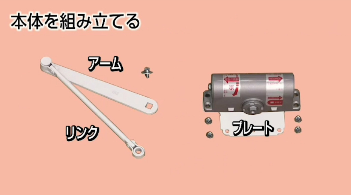 取換用ドアクローザー(本体)にアームとプレートを貼り付けて、外した時と逆の手順で取り付けていきます。