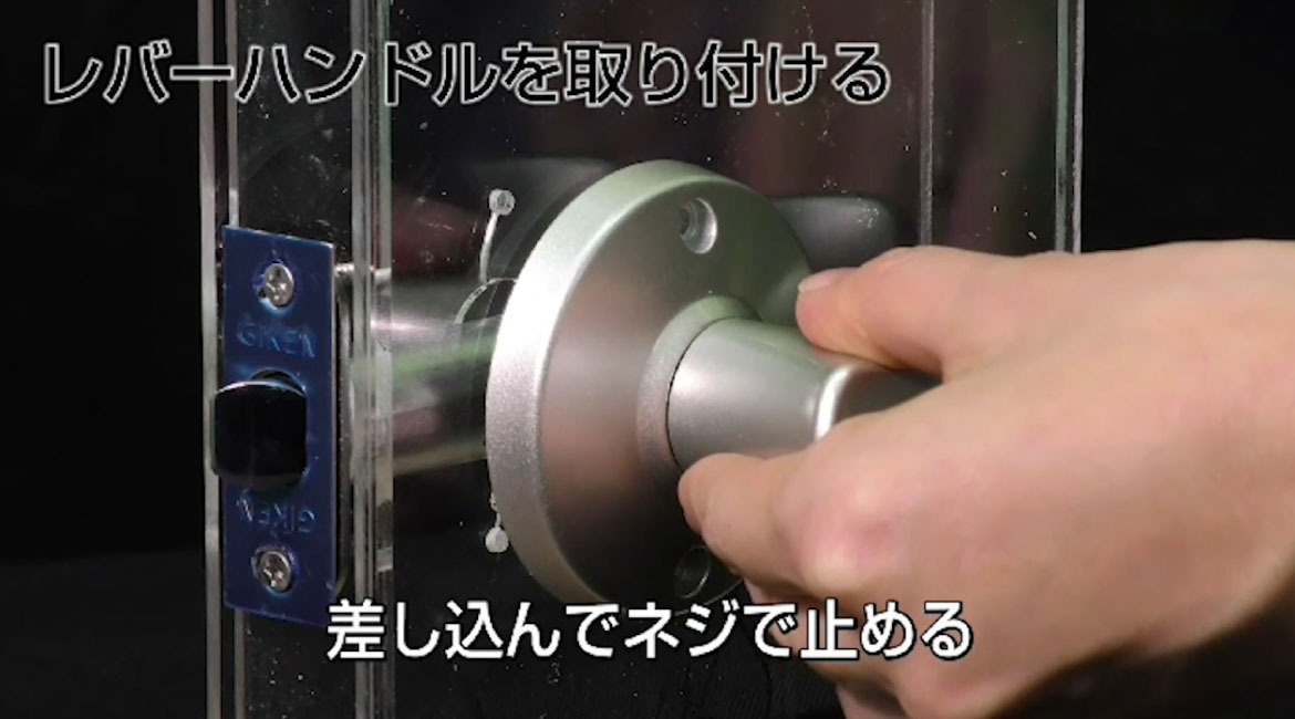 レバーハンドルを差し込み、ネジで留めていきます。反対側も同様に取り付けていきましょう。