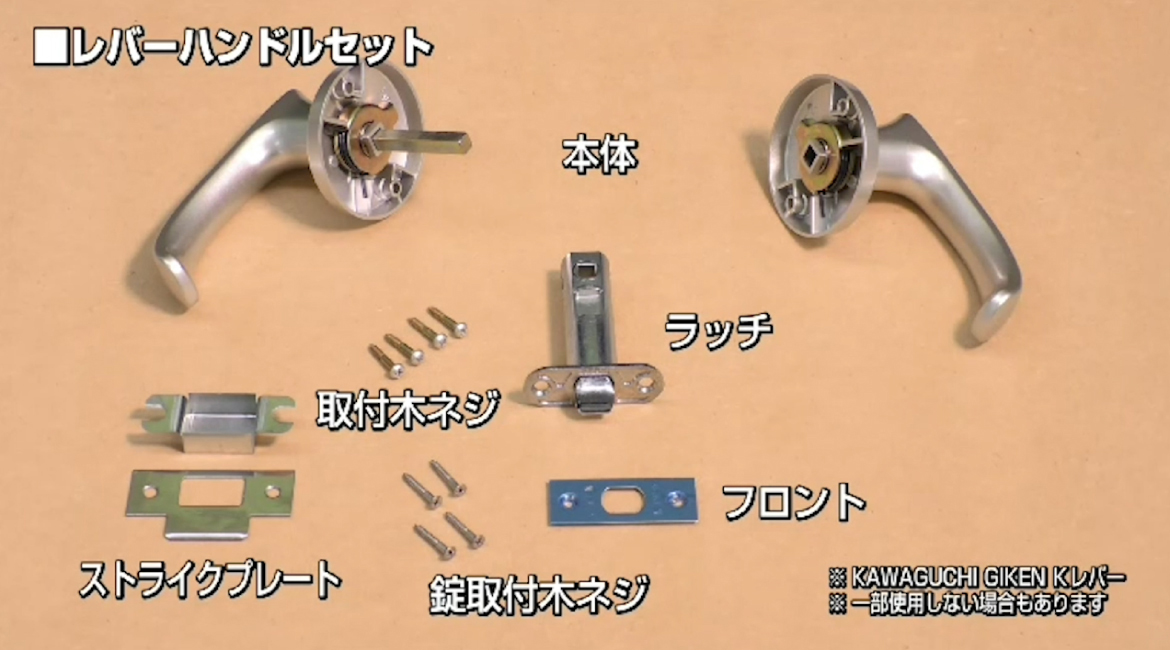 用意するもの・レバーハンドル(本体) ・ラッチ ・フロント ・取付木ネジ ・錠取付木ネジ ・ストライクプレート ・定規 ・プラスドライバー