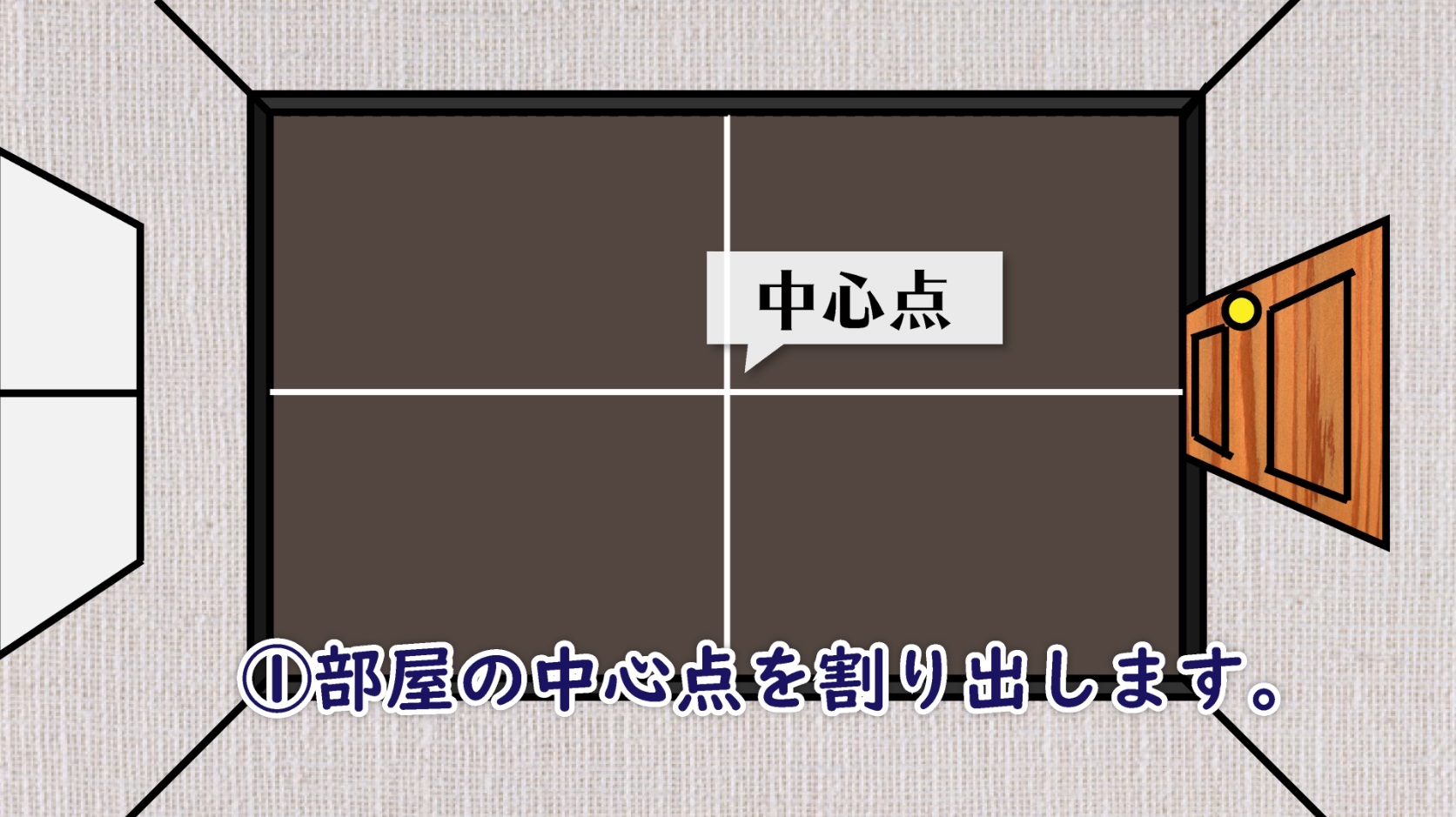 部屋の中心点を割り出します。中心点を基準に並べていき、はみ出た部分をカットします。残りの4ヶ所も同様に施工します。