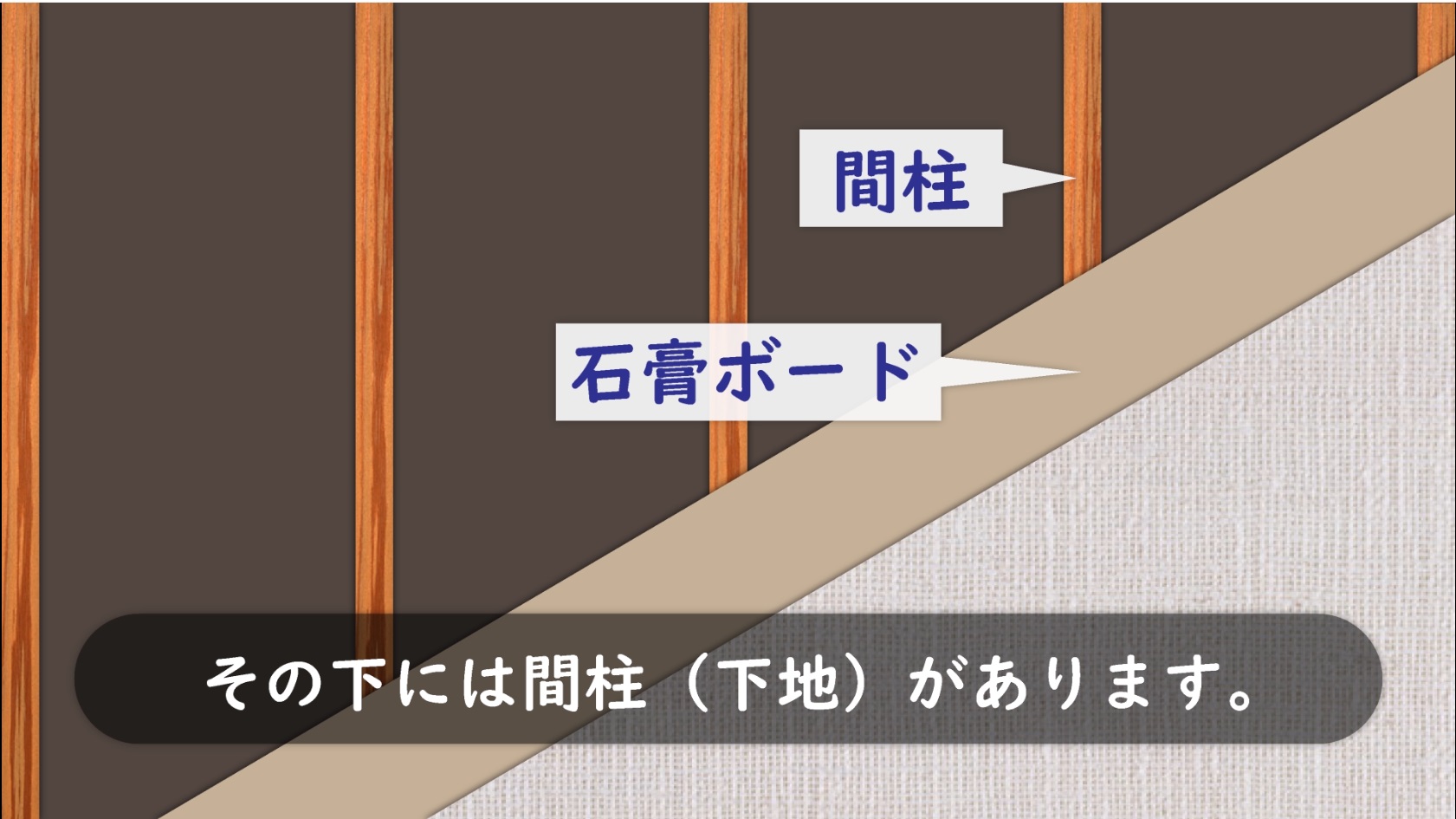 壁紙の下には石膏ボードがあり、さらにその下には間柱(下地)があります。(一般的に間柱は450mm間隔)