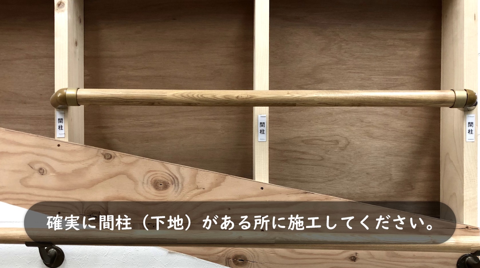 ②ブラケットのネジ穴にネジを取り付けます。確実に間柱(下地)のある場所に施工してください。