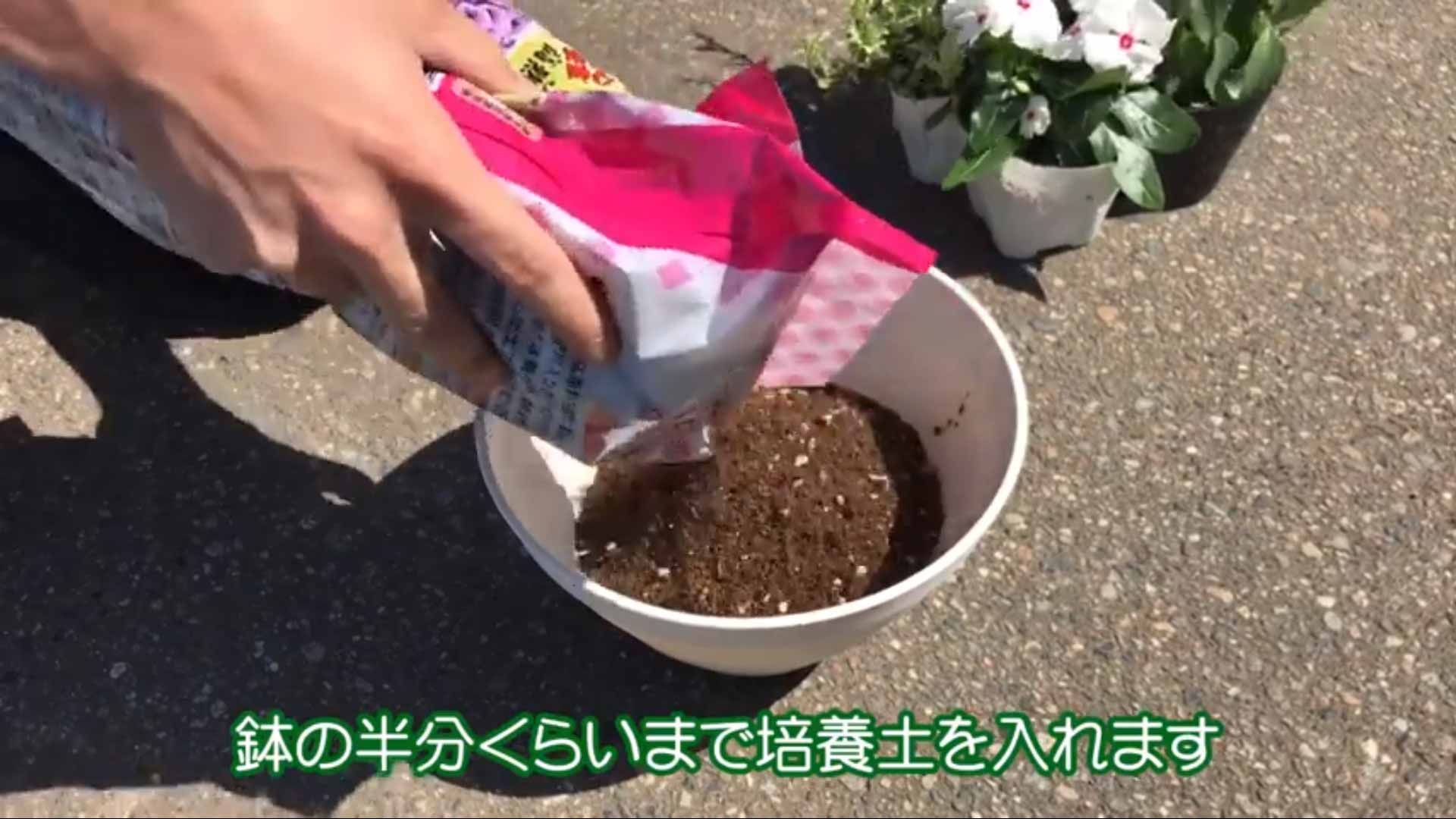 2. 鉢の半分くらいまで培養土を入れます