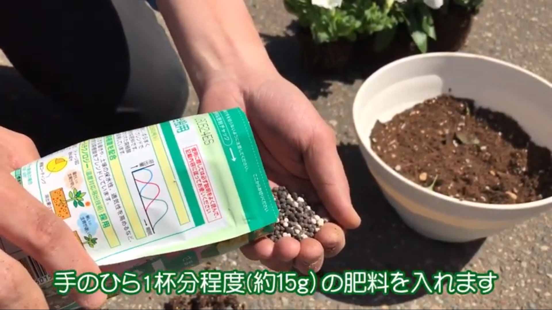 3. 手のひら1杯分程度(約15g)の肥料を入れます