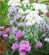 小さな花をまとめて咲かせます。花色は桃、青、白などがあります。