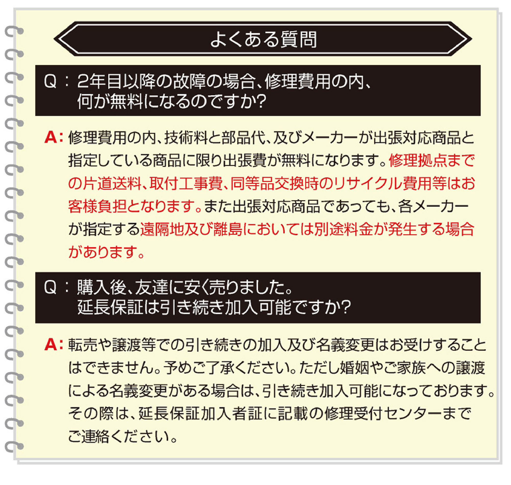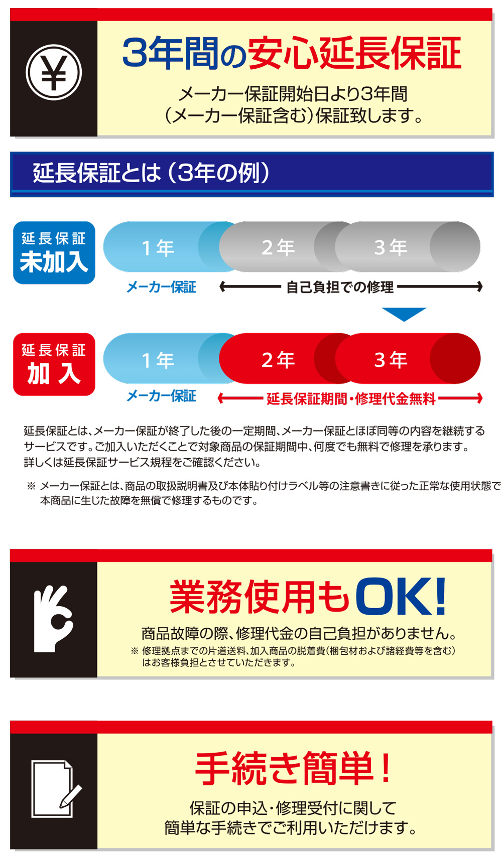 保証期間中、延長保証申し込み商品の自然故障に伴う修理代金を3年間「何度でも」保証いたします。