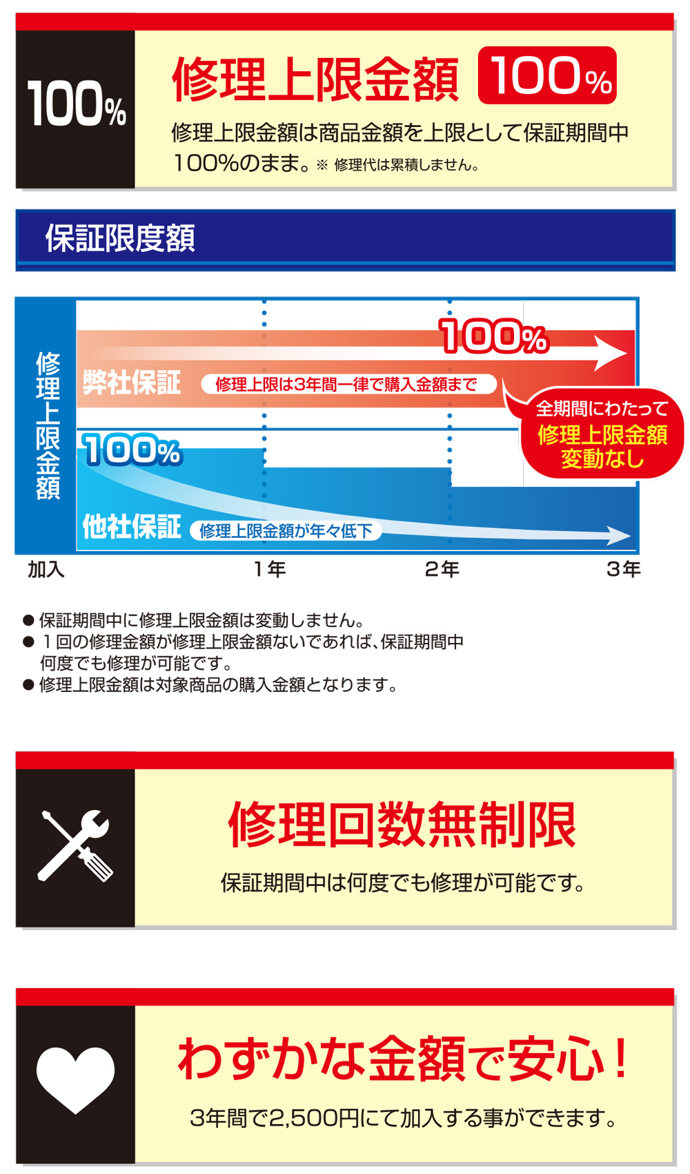 万が一の製品の故障に備え、メーカー保証が終了した後も、メーカー保証とほぼ同等の保証内容を提供するサービスです。保証限度額(購入金額)まで何度でも修理を受けられます。