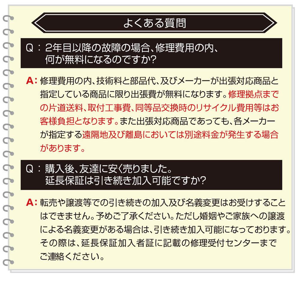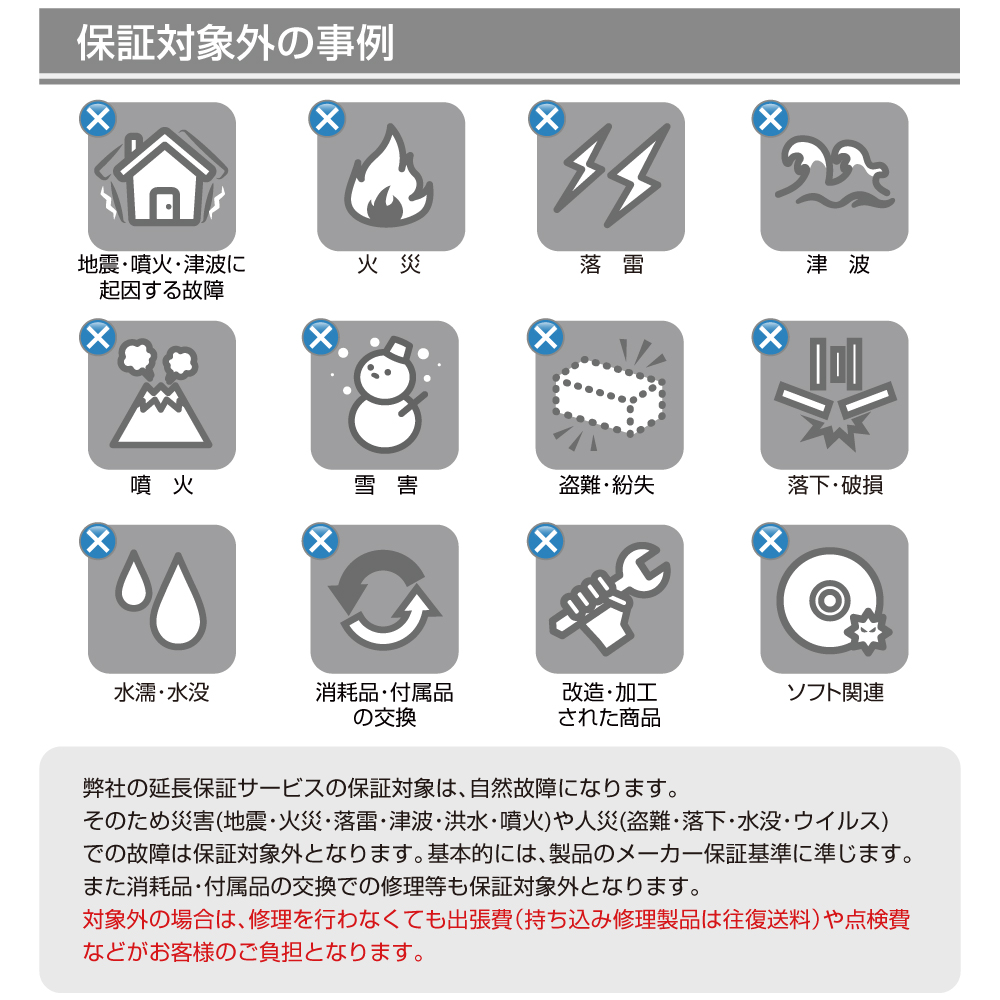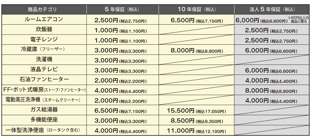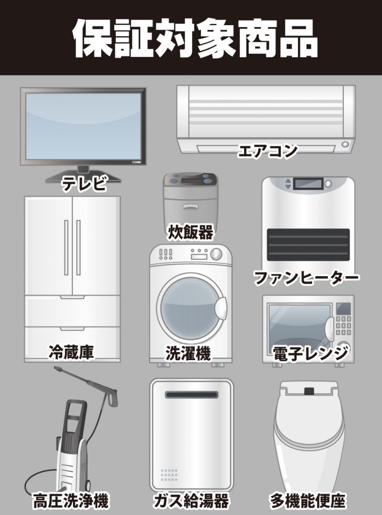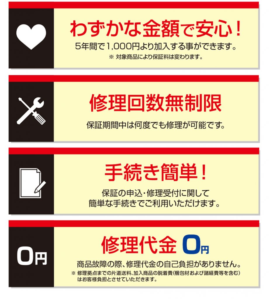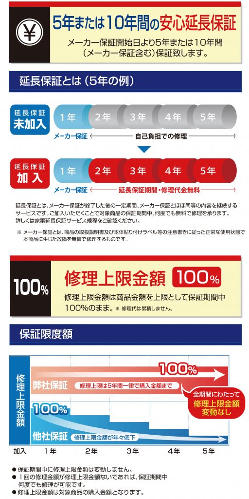 保証期間中、延長保証申し込み商品の自然故障に伴う修理代金を最長10年間「何度でも」保証いたします。家電製品を安心してお使いいただくために、延長保証にぜひご加入ください。