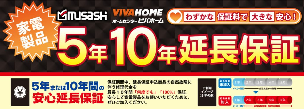ビバホーム・ムサシでは、修理回数無制限+全期間修理上限金額100%の家電延長保証サービスがご利用いただけます。