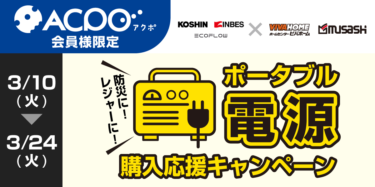 工進、インベス、エコフローのポータブル電源などが対象となります。
