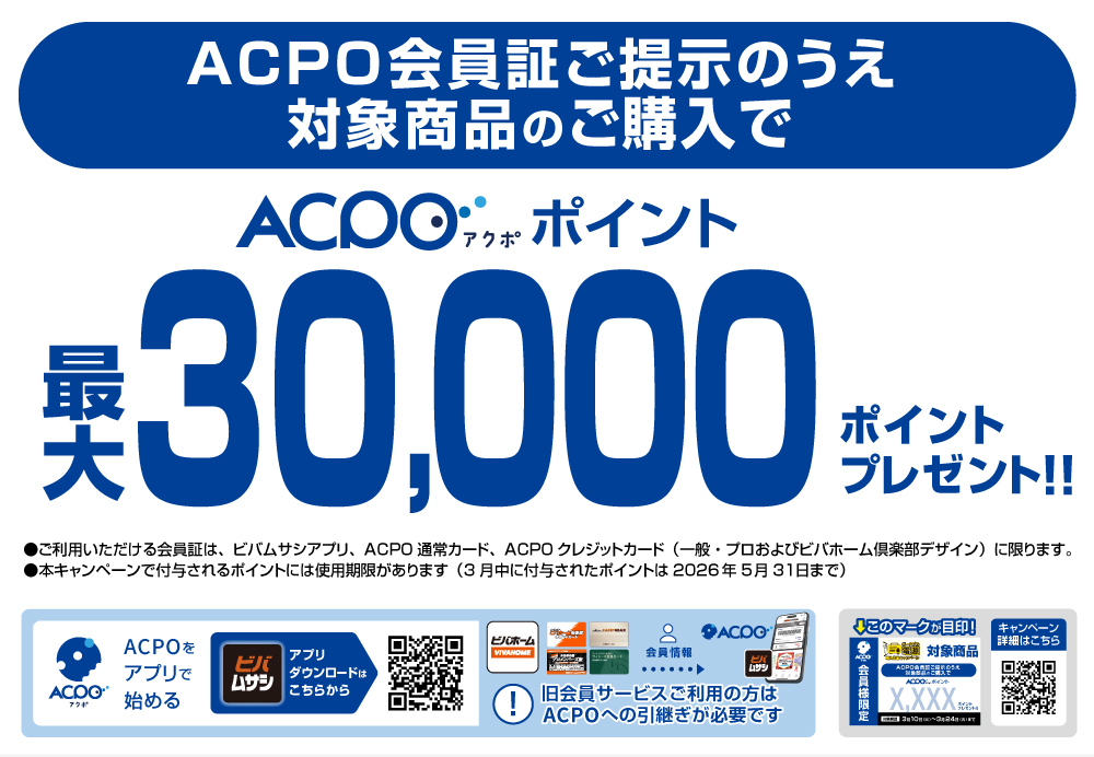 期間中、ACPO会員証ご提示のうえ、対象商品を購入で最大30,000ポイントプレゼント🎁