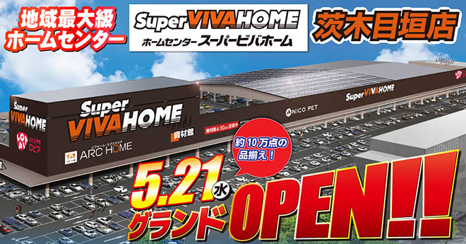 巨大ホームセンター、スーパービバホーム茨木目垣が5月21日(水)朝9時オープン致します!!