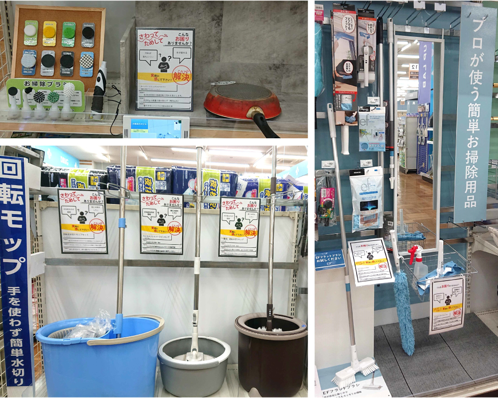 ほうきや回転水切りモップなどの商品を体感し、納得して商品をお選びいただけます。日々のお掃除の時短や効率UPに是非お役立てください!